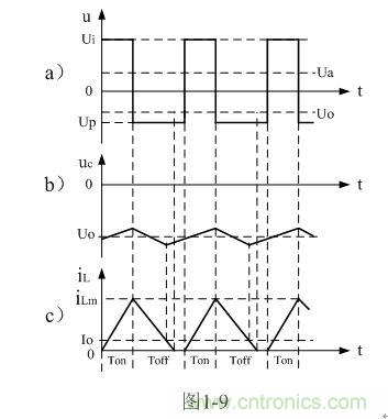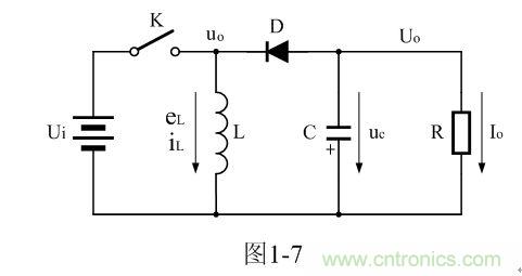 圖1-7中,Ui為輸入電源,K為控制開關,L為儲能電感,D為整流二極管,C為儲能濾波電容,R為負載電阻。當控制開關K接通的時候,輸入電源Ui開始對儲能電感L加電,流過儲能電感L的電流開始增加,同時電流在儲能電感中也要產(chǎn)生磁場;當控制開關K由接通轉(zhuǎn)為關斷的時候,儲能電感會產(chǎn)生反電動勢,使電流繼續(xù)流動,并通過整流二極管D進行整流,再經(jīng)電容儲能濾波,然后向負載R提供電流輸出。控制開關K不斷地反復接通和關斷過程,在負載R上就可以得到一個負極性的電壓輸出。