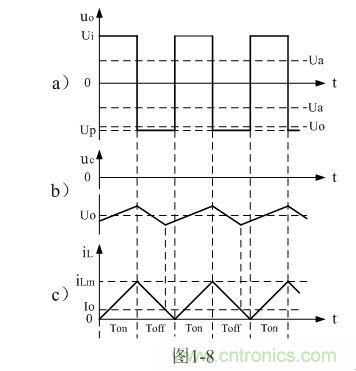 順便指出,反轉(zhuǎn)式串聯(lián)開關電源輸出電壓為負脈沖,當圖1-7中的濾波電容器C開路時,負脈沖的幅度將非常高,負脈沖是一個幅度按指數(shù)規(guī)律下降的尖脈沖,其幅度主要由負載電阻的大小,以及占空比來決定;當圖7中的濾波電容器C接入后,反轉(zhuǎn)式串聯(lián)開關電源輸出電壓uo為一負方波,此方波我們可稱之為半波平均值,關于半波平均值的概念我們后面還會詳細解釋。