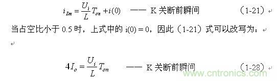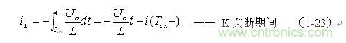 上式中i(Ton+)為控制開關K從Ton轉(zhuǎn)換到Toff的瞬間流過電感的電流,i(Ton+)也可以寫為i(Toff-),即:控制開關K關斷或接通瞬間,之前和之后流過電感L的電流相等。實際上(1-23)式中的i(Ton+)就是(1-21)式中的iLm,即: