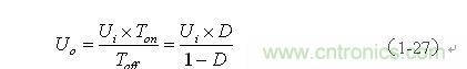 由(1-27)式可以看出,反轉(zhuǎn)式串聯(lián)開關電源輸出電壓與輸入電壓與開關接通的時間成正比,與開關關斷的時間成反比,而與儲能電感L的大小無關;與儲能電感L有關的是輸出電流的大小,電流的大小隱含在(1-21)、(1-25)、(1-26)式中。