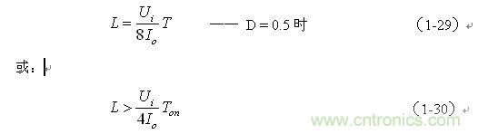 (1-29)和(1-30)式,就是計算反轉(zhuǎn)式串聯(lián)開關電源中儲能電感的公式。同理,(1-29)和(1-30)式的計算結(jié)果,只給出了計算反轉(zhuǎn)式串聯(lián)開關電源儲能電感L的中間值,或平均值,由于輸出電流的不確定性,實際應用時,可以以此為極限,在此平均值的計算結(jié)果上再乘以一個大于1的系數(shù)。