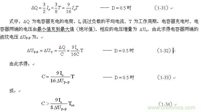 (1-33)和(1-34)式,就是計算反轉(zhuǎn)式串聯(lián)開關電源儲能濾波電容的公式(D = 0.5時)。式中:Io是流過負載電流的平均值,T為開關工作周期,ΔUP-P為濾波輸出電壓的波紋。一般波紋電壓都是取峰-峰值,因此,當D = 0.5時,波紋電壓正好等于電容器充電的電壓增量,即:ΔUP-P = ΔUc 。