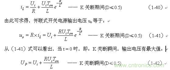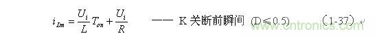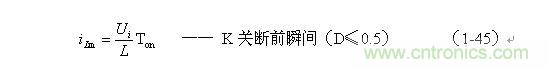 (1-44)式中iL為流過儲能電感L的電流(瞬時值),t為時間變量;i(0)為的初始電流,即:控制開關(guān)K接通前的瞬間流過儲能電感L中的電流。當開關(guān)電源工作于電流臨界連續(xù)狀態(tài),或不連續(xù)電流狀態(tài)時(即D≤0.5),i(0) = 0 ,由此可以求得流過儲能電感L的最大電流為: