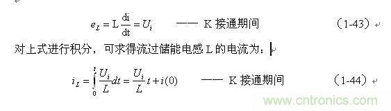 式中的負號表示反電動勢eL的極性與(1-35)式中的符號相反,即: K關(guān)斷期間電感L產(chǎn)生電動勢的方向與K接通期間電感L產(chǎn)生電動勢的方向正好相反。