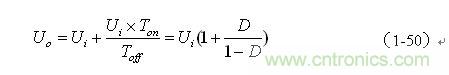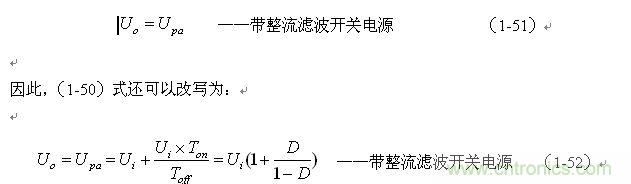 這里特別指出:(1-50)和(1-52)式的結(jié)果,雖然是以開關(guān)電源工作于電流臨界連續(xù)狀態(tài)的條件求得,但對于開關(guān)電源工作于連續(xù)電流狀態(tài)或斷流狀態(tài)同樣成立,因為,輸出電壓Uo是取自輸出脈沖電壓uo的半波平均值Upa,而不是取其平均值Ua。