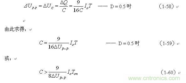(1-59)和(1-60)式,就是計算并聯(lián)式開關(guān)電源儲能濾波電容的公式。式中:Io是流過負載電流的平均值,T為開關(guān)工作周期,ΔUP-P為濾波輸出電壓紋波,此紋波電壓ΔUP-P實際上就是電容器兩端的充放電電壓增量,即:ΔUP-P = ΔUc 。