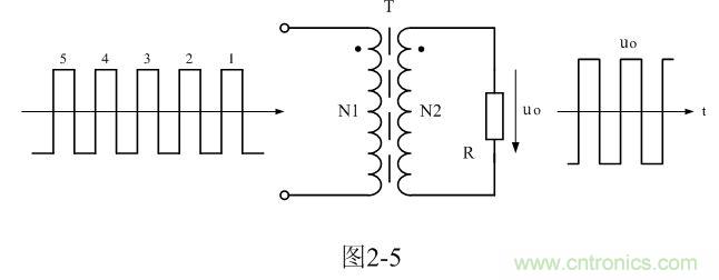 為了簡(jiǎn)單起見(jiàn),我們把雙激式變壓器開關(guān)電源等效成如圖2-5所示電路。圖2-5與圖2-1所示電路的不同之處在于,圖2-1輸入電壓是直流脈沖方波,而圖2-5輸入電壓是交流脈沖電壓方波。因此,圖2-5所示電路與一般的變壓器電路在工作原理上沒(méi)有根本的區(qū)別。