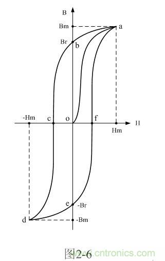 圖2-6是雙激式開關(guān)變壓器鐵芯磁感應(yīng)強(qiáng)度B與磁場(chǎng)強(qiáng)度H之間的關(guān)系曲線圖,或稱變壓器鐵芯磁化曲線圖或磁滯回線圖。之所以把圖2-6磁滯回線圖,是因?yàn)榇鸥袘?yīng)強(qiáng)度B比磁場(chǎng)強(qiáng)度H滯后一個(gè)相位或者一段時(shí)間。