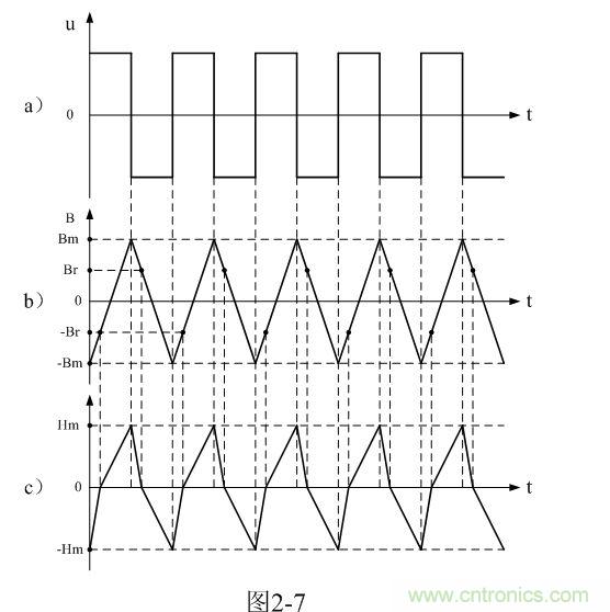 從圖2-7-a)和圖2-7-b)可以看出,每輸入一個(gè)交流脈沖電壓,變壓器鐵芯中的磁感應(yīng)強(qiáng)度B或磁通