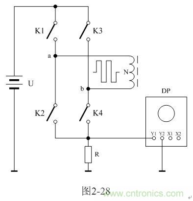 圖2-28中,U是電源電壓,N為變壓器初級線圈,控制開關(guān)K1、K2、K3、K4組成橋式開關(guān)控制電路,K1和K4為一組,K2和K3為一組,兩組開關(guān)輪流接通與斷開,把電源電壓正反向加于變壓器初級線圈兩端;R為取樣電阻,通過測量R兩端的電壓,就可以知道流過變壓器初級線圈的電流;取樣電壓被送到示波器DP進行顯示。