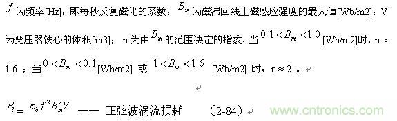 當加到變壓器初級線圈兩端的電壓為正弦波時,變壓器鐵芯的磁滯損耗和渦流損耗可分別用下面的(2-83)和(2-84)經(jīng)驗公式進行估算: