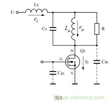 因此,當(dāng)開關(guān)管剛開始導(dǎo)通時(shí),流過開關(guān)管的電流是由小變大,這個(gè)過程,與在電感兩端加一電壓方波時(shí),流過電感的電流由小變大很相似;所以,在開關(guān)管剛導(dǎo)通的一瞬間,開關(guān)管的漏極和源極之間可以等效成一個(gè)電感Lds。由于這個(gè)電感相對(duì)分布電感Ls和勵(lì)磁電感Lu 來(lái)說(shuō)很小,所以圖3中沒有畫出。