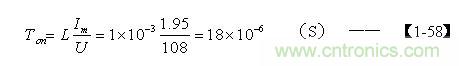 當(dāng)占空比等于0.5時(shí),對應(yīng)的輸入電壓U為108V,對應(yīng)的最大電流Im為1.95A,假設(shè)開關(guān)變壓器初級線圈的電感量L=1000uH,根據(jù)【1-45】式,可求得Ton的值為: