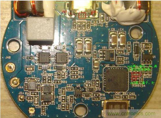 重點(diǎn)來(lái)了,點(diǎn)金石底部有三顆螺絲,撕掉那層膠墊就能看到。拆掉螺絲后,用硬物從插充電線(xiàn)的那個(gè)四方口可以很輕松的把底蓋撬開(kāi)。然后是電路板,在micro接口那端是用膠水將電路板粘在下面的金屬塊上的,還是老辦法,用吹風(fēng)機(jī)吹熱,然后小心翹下來(lái)。要注意的是,翹電路板的時(shí)候注意別弄斷角落上兩根頭發(fā)絲那么細(xì)的線(xiàn)圈。其實(shí)為保險(xiǎn)起見(jiàn),還如不先用烙鐵把這兩根線(xiàn)焊下來(lái)再拆電路板。電路板拆開(kāi)可以看到一塊金屬,上面若干螺絲,拆吧。拆出金屬塊,你會(huì)發(fā)現(xiàn)金屬塊的背面粘了一塊形狀挺藝術(shù)的磁塊,用刀片切斷膠就可以弄下來(lái)了。