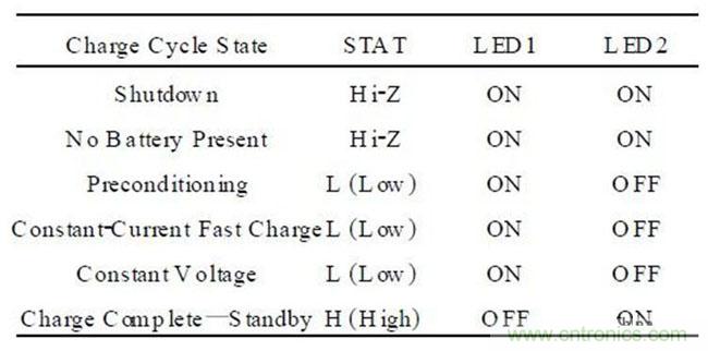 表1:MCP73831 電路設(shè)計中指示燈的邏輯關(guān)系
