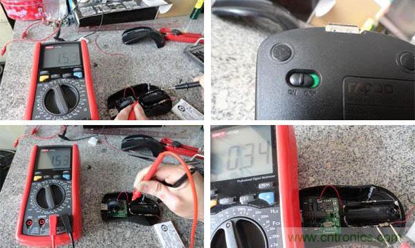 在萬(wàn)用表測(cè)試后,我們能夠看到接入后USB電壓為4.87V,鋰電池兩端為4.01V。負(fù)載端為1.52V,再次打開(kāi)鼠標(biāo)電源開(kāi)關(guān)。出現(xiàn)1.54V,竟然還高了,這個(gè)應(yīng)該關(guān)系到阻抗和容抗問(wèn)題,水平不夠,不好解釋?zhuān)凑彤?dāng)它正常了。