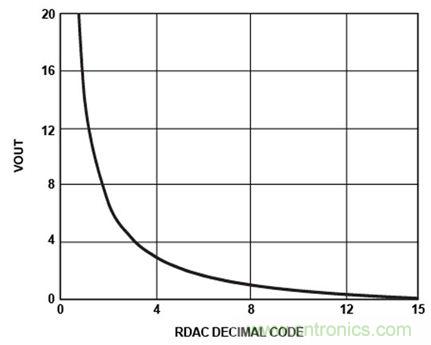 以RAW和RWB代替R1和R2可實(shí)現(xiàn)對(duì)數(shù)傳遞函數(shù)。數(shù)字碼和輸出電壓之間的非線性關(guān)系降低了低端分辨率。圖5顯示了這個(gè)取自數(shù)字電位計(jì)的對(duì)數(shù)傳遞函數(shù)。