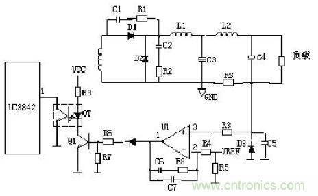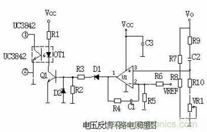 當(dāng)輸出U0降低時(shí),U1③腳電壓降低,當(dāng)其低過(guò)U1②腳基準(zhǔn)電壓后U1①腳輸出低電平,Q1不導(dǎo)通,光耦OT1發(fā)光二極管不發(fā)光,光電三極管不導(dǎo)通,UC3842①腳電位升高,從而改變U1⑥腳輸出占空比增大,U0降低。周而復(fù)始,從而使輸出電壓保持穩(wěn)定。調(diào)節(jié)VR1可改變輸出電壓值。
