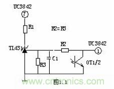 當(dāng)輸出短路,UC3842①腳電壓上升,U1 ③腳 電位高于②腳時(shí),比較器翻轉(zhuǎn)①腳輸出高電位,給 C1充電,當(dāng)C1兩端電壓超過(guò)⑤腳基準(zhǔn)電壓時(shí) U1⑦腳輸出低電位,UC3842①腳低于1V,UCC3842 停止工作,輸出電壓為0V,周而復(fù)始,當(dāng)短路 消失后電路正常工作。R2、C1是充放電時(shí)間常數(shù), 阻值不對(duì)時(shí)短路保護(hù)不起作用。