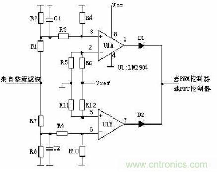 Q1關(guān)斷時(shí)施放能量。D1是啟動(dòng)二極管。D2是PFC整流二極管,C6、C7濾波。PFC電壓一路送后級(jí)電路,另一路經(jīng)R3、R4分壓后送入PFC控制器作為PFC輸出電壓的取樣,用以調(diào)整控制信號(hào)的占空比,穩(wěn)定PFC輸出電壓。