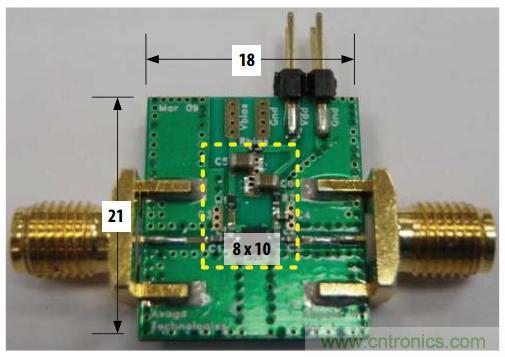 圖中PCB的尺寸為21.5×18×1.4mm,PCB板材有兩層,頂層為Rogers的RO4350,厚度為10mil,底層為低成本的FR4,厚度為 1.2mm,二者的接地銅箔緊緊的結合在一起。射頻連接器是Johnson的SMA接頭,DC電源接頭是2-pin的連接器,被動元件的尺寸都是0402 的,這樣整個元器件區(qū)域的大小約為8×10mm2。