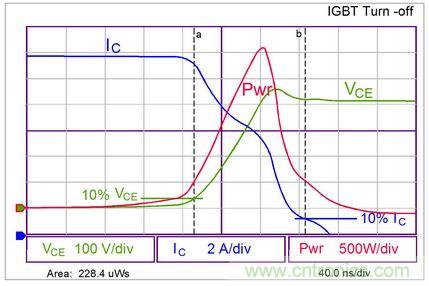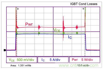 導(dǎo)電損耗的量測方式類似。它們應(yīng)當(dāng)起于導(dǎo)通損耗終點,終于關(guān)閉損耗起點。這可能難于精確量測,因為導(dǎo)電損耗的時間刻度遠(yuǎn)大于