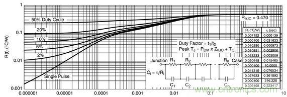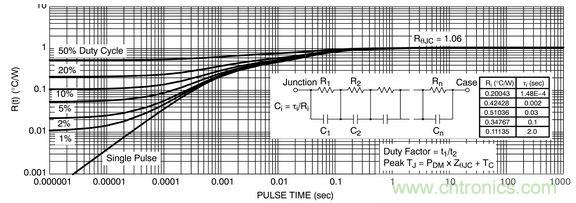 安森美半導(dǎo)體IGBT組件的數(shù)據(jù)表中包含IGBT及二極管θ值圖表。穩(wěn)態(tài)θ值如圖7及圖8中的圖表所示。IGBT的θ值為0.470 °C/W,二極管為1.06 °C/W。計算中還要求另一項熱系數(shù),即兩個裸片之間的熱交互影響常數(shù)ψ。測試顯示對于TO-247、TO-220及類似封裝而言,此常數(shù)約為0.15 °C/W,下面的示例中將使用此常數(shù)。