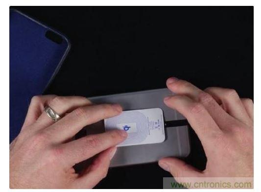 3、接下來(lái)的任務(wù)就是將接收器的金屬觸電與智能手機(jī)電池連接了,這是整個(gè)過(guò)程中最有難度的部分。不過(guò)只要細(xì)心,保證每一個(gè)金屬觸電都連接到一起就可以弄好。調(diào)整好位置后,將模塊貼到電池上;