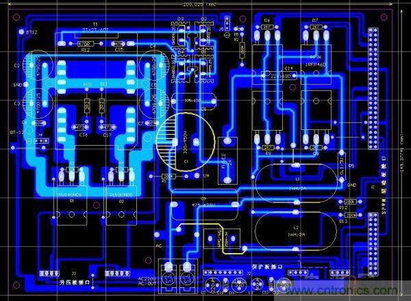 下面是功率主板的PCB截圖,長(zhǎng)寬為200X150MM,因?yàn)?,這部分的電路比較簡(jiǎn)單,就不給出原理圖了,直接畫了PCB圖,如圖1所示。
