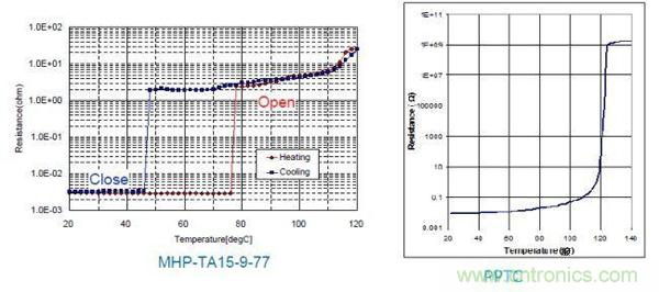 因此,不論哪種方式的快速充電,都是通過提高充電電流或功率來加速鋰電池芯內(nèi)部的反應來實現(xiàn)的,必須通過更多的保護來防止由于電池芯的熱失控而引起的起火甚至爆炸。TE的PPTC和MHP-TA 可以有效地提供這種保護,MHP-TA是結(jié)合了雙金屬片和PPTC的溫度/電流保護器件,溫度保護更加精確,可以適用于電流較大、溫度保護要求更高的電子設(shè)備,如:智能手機、平板電腦、超級本、筆記本電腦等。MHP-TA及PPTC的特性及應用如下圖,緊貼電池芯的設(shè)計可以使MHP-TA和PPTC更好的感測電池溫度,當電池溫度異常升高時可以呈現(xiàn)高阻,阻礙電池的充放電電流,確保電池的安全使用。