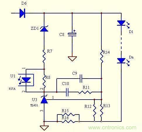 原理:此電路同樣是利用了TL431的2.495V的基準(zhǔn)來(lái)做恒流,跟上面的電路不同點(diǎn)在于減少了電流取樣電路的電壓,只要合計(jì)設(shè)計(jì)R12,R13,R14的值,可以限制LED上面的壓降。