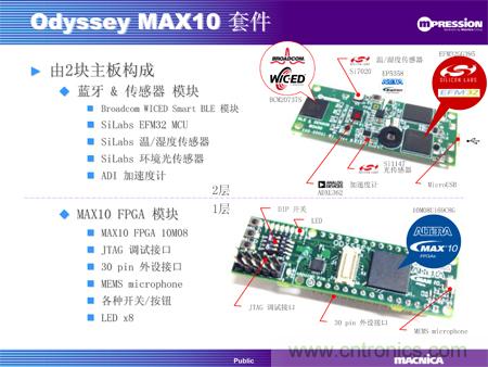 MAX 10 FPGA板卡以Altera的MAX10為核心,帶有30個插針的擴展接口、紐扣電池接口、JTAG調(diào)試接口、各種開關(guān)/按鈕和8個LED。藍牙及傳感器板集成了一個藍牙4.0模塊、一個32位處理器、溫度/濕度傳感器、紫外線/光敏/距離傳感器和加速度傳感器。