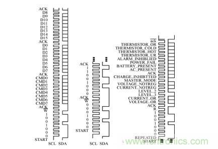 從圖4可見:89C51與MAX1647通信的開始條件是SDA端口為下降沿,同時(shí)SCL端口為高電平;MAX1647的 WRITE-WORD協(xié)議為0b00010010(0b表示二進(jìn)制),或者可表示為0x12(0x表示十六進(jìn)制);READ-WORD協(xié)議則可表示為 0b00010011或者0x13。另外,CMD0~CMD7代表具體的命令,D0~D15表示數(shù)據(jù)位。幾個(gè)常用的WRITE-WORD協(xié)議命令:ChargerMode()命令,命令代碼為0x12,主要用于清零和復(fù)位;ChargingVolage()命令,命令代碼為0x15,主要用于電壓預(yù)置;ChargingCurrent()命令,主要用于電流預(yù)置,命令代碼為0x14,即CMD7~CMD0的數(shù)據(jù)為00010100,16位二進(jìn)制數(shù)值由D15~D0組成表示Io的電流值,單位為mA。當(dāng)端子SEL與AGND短接時(shí),電流Io的最大預(yù)置值為1.023A;如果讓端子SEL懸空,則 Io的最大預(yù)置值為2.047A;當(dāng)端子SEL與VL短接,則Io的最大預(yù)置值為4.095A。MAX1647提供兩個(gè)電流源給負(fù)載供電:一個(gè)來自內(nèi)部的線性電流源IOUT,一個(gè)是開關(guān)電路提供的電流。IOUT提供1mA~31mA的電流(步長為1mA)。例如,當(dāng)Io最大預(yù)置值為4.095A時(shí),數(shù)據(jù)位 D11~D6對應(yīng)為6位電流預(yù)置DAC的DA5~DA0位;數(shù)據(jù)位D4~D0對應(yīng)輸出電流IOUT的I4~I(xiàn)0,表示IOUT線性電流源二進(jìn)調(diào)整數(shù)。注意任何時(shí)候DAC位被置位,線性電流源被調(diào)整至滿幅(31mA)。AlarmWarning()命令,命令代碼為0x16,主要用于保護(hù)設(shè)置;ChargerStatus()命令,命令代碼為0x13,主要用于返回溫度傳感器以及MAX1647的內(nèi)部信息,這些信息暫存D15~D0位中。