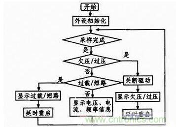 系統(tǒng)上電后,首先完成各個(gè)外設(shè)的初始化,主要包括系統(tǒng)時(shí)鐘、定時(shí)器、GPIO口、ADC、DMA、中斷及SPI的初始化。在此,定時(shí)器和中斷一旦初始化完成,PWM及SPWM波就會(huì)生成。考慮到過流、短路保護(hù)及反饋穩(wěn)壓的實(shí)時(shí)性要求較高,故在中斷內(nèi)完成。欠壓、過壓對(duì)實(shí)時(shí)性要求低,放在主程序內(nèi)。為提升系統(tǒng)的性能,ADC采樣使用DMA方式傳輸數(shù)據(jù),傳輸完成后,發(fā)出中斷申請(qǐng),對(duì)采集到的數(shù)據(jù)進(jìn)行簡(jiǎn)單濾波處理,其他功能函數(shù)調(diào)用此數(shù)據(jù)完成相應(yīng)的保護(hù)及穩(wěn)壓功能。主程序的流程圖如圖6所示。