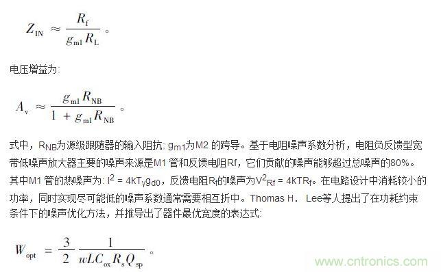 ③ M1 的溝道熱噪聲被反饋電路降低,在寬頻帶范圍內(nèi)實現(xiàn)噪聲系數(shù)NF<3. 6 dB。通過分析小信號模型和噪聲系數(shù),得到該結(jié)構(gòu)的輸入阻抗為: