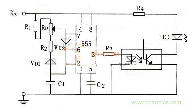 1、此電路可去掉VD1、VD2以及滑動(dòng)變阻器Rp,這樣5定時(shí)器就會(huì)輸出占空比不變的脈沖波形。