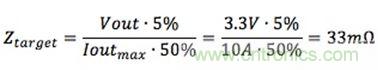 拿12V輸入、3.3V/10A輸出VRM要求作為例子,目標(biāo)阻抗的計算公式是:
