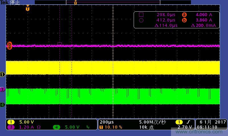 注:4A/7A/10A時(shí)的輸出電流波形。其中:①黃色:高端驅(qū)動(dòng)波形;④綠色:低端驅(qū)動(dòng)波形;③紫色:輸出電流