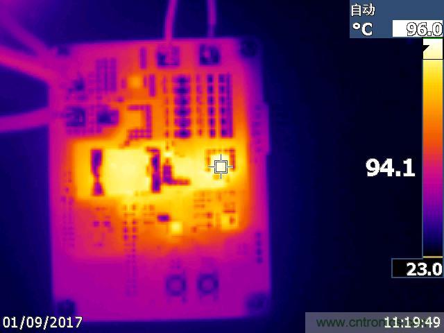 Q1(高端MOS):94.1℃;Q3(低端MOS):88.8℃;Q2(輸出開(kāi)關(guān)MOS):72.5℃;L1(功率電感):89.4℃;U2(控制芯片):88.5℃