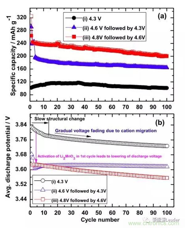 富鋰材料活化制度是影響其循環(huán)性能的一個(gè)重要因素,以色列科學(xué)家Prasant Kumar Nayak等研究顯示,活化電壓和循環(huán)電壓對(duì)于富鋰材料的循環(huán)性能都有十分顯著的影響,例如他們發(fā)現(xiàn)Li1.17Ni0.25Mn0.58O2在經(jīng)過4.8V活化,并在2.3-4.6V之間循環(huán)的電池,雖然容量高達(dá)242mAh/g,但是循環(huán)性能很差,并且循環(huán)100次后電壓平臺(tái)從3.62V衰降到了3.55V,而經(jīng)過4.6V活化,并在2.3V-4.3V之間循環(huán)的電池,雖然比容量較低僅為160mAh/g,但是循環(huán)性能優(yōu)異,并且循環(huán)100次未出現(xiàn)平臺(tái)電壓衰降,如下圖所示,而沒有經(jīng)過高電壓活化的材料,容量較低僅為100mAh/g左右,可見富鋰材料的活化制度和循環(huán)制度對(duì)于富鋰材料的循環(huán)具有巨大的影響。