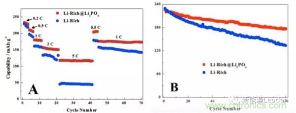 華南師范大學(xué)的Dongrui Chen等借助聚多巴胺模版法,利用Li3PO4對(duì)富鋰材料進(jìn)行了包覆處理,Li3PO4包覆層的厚度僅為5nm左右。Li3PO4包覆層極大的改善了富鋰的材料的循環(huán)性能,0.2C,2.0-4.8V循環(huán)100次,容量保持率為78%,而沒有經(jīng)過包覆處理的富鋰材料容量保持率僅為58%,同時(shí)Li3PO4包覆層也顯著提高了富鋰的材料的倍率性能,如下圖所示。