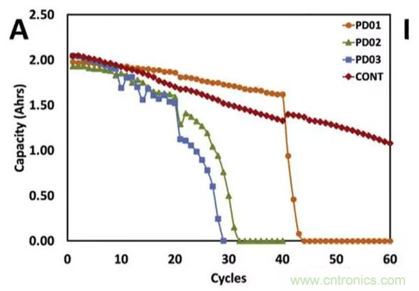 針對(duì)三個(gè)階段電池的衰降機(jī)理的研究認(rèn)為,階段1可能是因?yàn)殡姵豐EI膜生長(zhǎng)需要消耗一部分Li+,因此衰降速度較快。在階段2隨著SEI膜結(jié)構(gòu)的穩(wěn)定,內(nèi)部較為穩(wěn)定,因此衰降速度較慢,在階段3隨著電池老化,開(kāi)始發(fā)生活性物質(zhì)損失,電極活性界面減少,導(dǎo)致電池對(duì)于電流十分敏感。圖C是針對(duì)不同的截止電壓對(duì)電池衰降速度影響的實(shí)驗(yàn),從實(shí)驗(yàn)結(jié)果可以看到,當(dāng)把充電截止電壓提高到4.3V時(shí)會(huì)導(dǎo)致電池的循環(huán)性能急劇惡化,降低充電截止電壓可以有效的改善電池的循環(huán)性能。