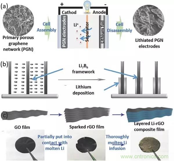 由于不存在鋰源,上述三種類型的CCs(即納米結(jié)構(gòu)銅、碳涂覆銅、自支撐碳框架)不能直接用于LMBs中。在LMBs中需要額外的將鋰電沉積到這些CCs中并進(jìn)行后續(xù)的電池拆卸過程。除了復(fù)雜性之外,這種組裝/拆卸過程可能引入雜質(zhì),引起副反應(yīng),并破壞負(fù)極的完整性。所以研究者又制造了含鋰合金,如Li-Mg、Li-B、Li-Sn等,并且在LMBs中使用時(shí)無枝晶形態(tài)。然而,高品質(zhì)鋰合金難以制備,特別是具有特定納米結(jié)構(gòu)的鋰合金。最近開發(fā)了熔融鋰浸液作為負(fù)載鋰的新技術(shù)。這種方法將傳統(tǒng)的加載過程從內(nèi)部轉(zhuǎn)移到外部,在可控性、加載質(zhì)量和CCs的選擇上更有優(yōu)勢。