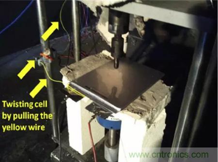 目前能夠模擬鋰離子電池內短路的方式有多種,例如針刺測試,小壓痕測試,BAJ測試和機械擠壓測試等,通過對大尺寸方形電池特點的分析,Hsin Wang認為機械擠壓測試最適合應用方形鋰離子電池的測試上。但是在傳統(tǒng)的擠壓的測試中由于電池受到的破壞太大,幾乎所有的電池都會發(fā)生熱失控,因此傳統(tǒng)的擠壓測試對不同種類電池安全性的“分辨率”就很低,只有通過和不通過兩種結果,只能對鋰離子電池的安全性進行定性分析。可能兩個電池都沒有通過安全性測試,但是A電池的安全性卻要好于B電池,為了能夠準確的評估不同體系電池的安全性能,Hsin Wang對傳統(tǒng)的擠壓實驗進行了改進,通過在電池負極極耳上施加一個拉力,讓電池產(chǎn)生大約5°的扭曲,從而減少在擠壓過程中電池受到的破壞,因此該實驗能夠準確的評估不同種類電池的的安全性高低。