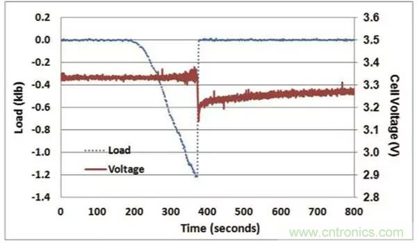 為了方便讀者理解本文,下圖是給出了LFP電池一個非常典型的成功通過機械擠壓測試(正反饋)的判據(jù),電池擠壓變形達到一定的程度后,引起了電池內短路的發(fā)生,電池電壓迅速下降,檢測到電壓下降后(0.1V),擠壓力隨之被移除,電池的電壓快速回升,電池沒有發(fā)生熱失控,則電池通過擠壓實驗。