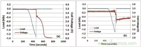 在對25Ah的NMC電池擠壓-扭轉測試中,發(fā)現(xiàn)50%SoC狀態(tài)下的電池都成功通過了測試,如圖a所示,60%SoC狀態(tài)下的電池有三只通過了測試,如圖b所示,另外的三只沒有通過測試,如圖c所示,可見60%SoC的電池通過測試和不通過測試的概率各為50%,而80%SoC的電池則都沒有通過測試,如圖d所示。由此可見,60%SoC是NMC電池安全性的一個分水嶺,低于這個數(shù)值時電池相對是安全的,高于這個數(shù)值,則電池在機械濫用的情況下的安全性將大大下降。
