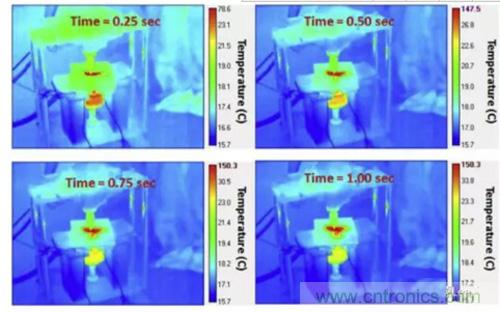 下圖為60%SoC的NMC電池在擠壓-扭轉實驗中的熱成像圖,從圖中可以看到在短路發(fā)生后,短路點的溫度在0.5S內迅速升高到了147.5 ℃,隨后高溫區(qū)域迅速向周圍擴展,說明周圍區(qū)域溫度升高并不是由熱傳導導致的,而是高溫引發(fā)了其他的化學反應。而在80%SoC下,NMC電池發(fā)生熱失控的溫度更高,引起周圍化學反應的速度也更快。
