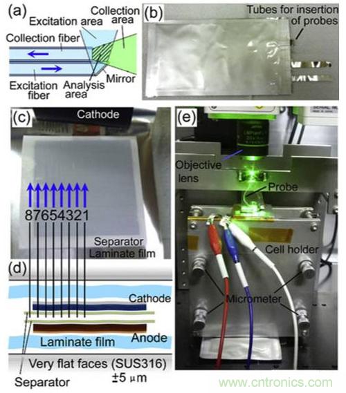 實驗中Toshiro Yamanaka采用了方形疊片電池作為研究對象,電解液則采用了EC和DEC溶劑,LiClO4作為電解質(zhì)鹽,為了能夠?qū)﹄娦緝?nèi)部電解液的行為進行實時觀測,Toshiro Yamanaka在疊片鋰離子電池內(nèi)部引入了8根光纖作為拉曼光譜的探測器,研究電解液在電池內(nèi)的浸潤和離子濃度的變化情況,8根光纖在電池內(nèi)的排布如下圖c所示: