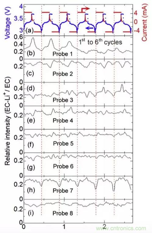 在研究Li+濃度的變化過程中,Toshiro Yamanaka還發(fā)現(xiàn)電解液的分布也隨著充放電而發(fā)生變化。下圖是在充放電過程中不同位置溶劑EC的強度的變化趨勢,EC的強度變化主要反映該處電解液的數(shù)量多少,隨著電芯的體積變化,電芯內(nèi)的電解液分布也在不斷的發(fā)生著變化。例如在1號和2號位置,EC的濃度發(fā)生了兩次快速下降和緩慢恢復,6號探測器的位置,則出現(xiàn)了EC濃度的快速下降和快速上升,這些變化都反映了鋰離子電池內(nèi)部在充放電過程中,由于電極的體積膨脹,導致電解液在電芯的局部發(fā)生變干、再浸潤的過程。