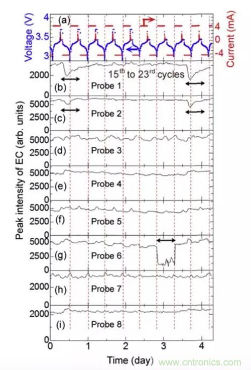 但是在循環(huán)30次以后,從1號光纖探測器到7號光纖探測器Li+濃度變化趨勢都變的一致,充電的時候濃度上升,放電的時候濃度下降,Toshiro Yamanaka認為這主要是因為在循環(huán)30次后,負極的SEI膜的結(jié)構(gòu)和成分逐漸穩(wěn)定,從而電芯的各個部分之間離子阻抗趨于一致的結(jié)果。但是每個光纖探測器的變化趨勢也有所不同,例如3號和4號光纖探測器位置充放電過程中離子濃度的變化就比較小,2號光纖探測器處的離子濃度變化逐漸變小,而5號探測器位置的離子濃度變化則逐漸增大。這表明此時鋰離子電池內(nèi)部仍然存在著較大的不均勻性,例如4號位置離子濃度變化比較小,表明此處在充放電過程中的反應速率較慢,引起局部SoC的不均勻,從而對電池的性能產(chǎn)生負面的影響。